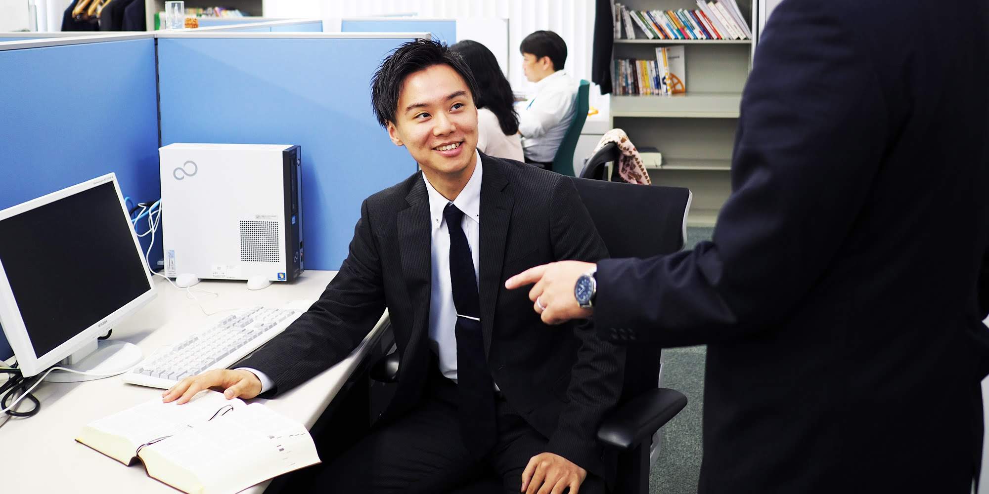 まず、執務室は、ワンフロアであり、個室はありません。入所するまでは、パートナーからすぐ見える距離にいるので、緊張しそうだと思っていたのですが、実際入所し仕事を始めてみれば、ワンフロアであることが理由で緊張を感じることはありませんでした。むしろ、ワンフロアであるからこそのメリットを多く感じています。それは、共同で仕事をしているパートナーや先輩へ質問や議論がしやすいということです。仕事で、悩んでいることがあるときなど、共同で事件を担当しているパートナーや先輩がすぐ近くにいるので、自分だけで抱え込まずに話しかけることができます。